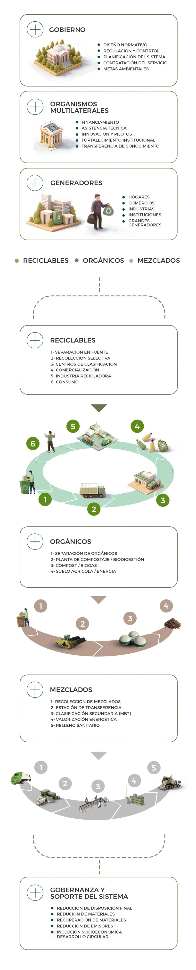 Contribuimos con el diseño y fortalecimiento de marcos normativos y estrategias integrales de gestión de residuos. Acompañamos a gobiernos en la definición de metas ambientales, planificación del sistema, estructuración de modelos de prestación y supervisión del servicio, asegurando estándares técnicos, ambientales y sociales